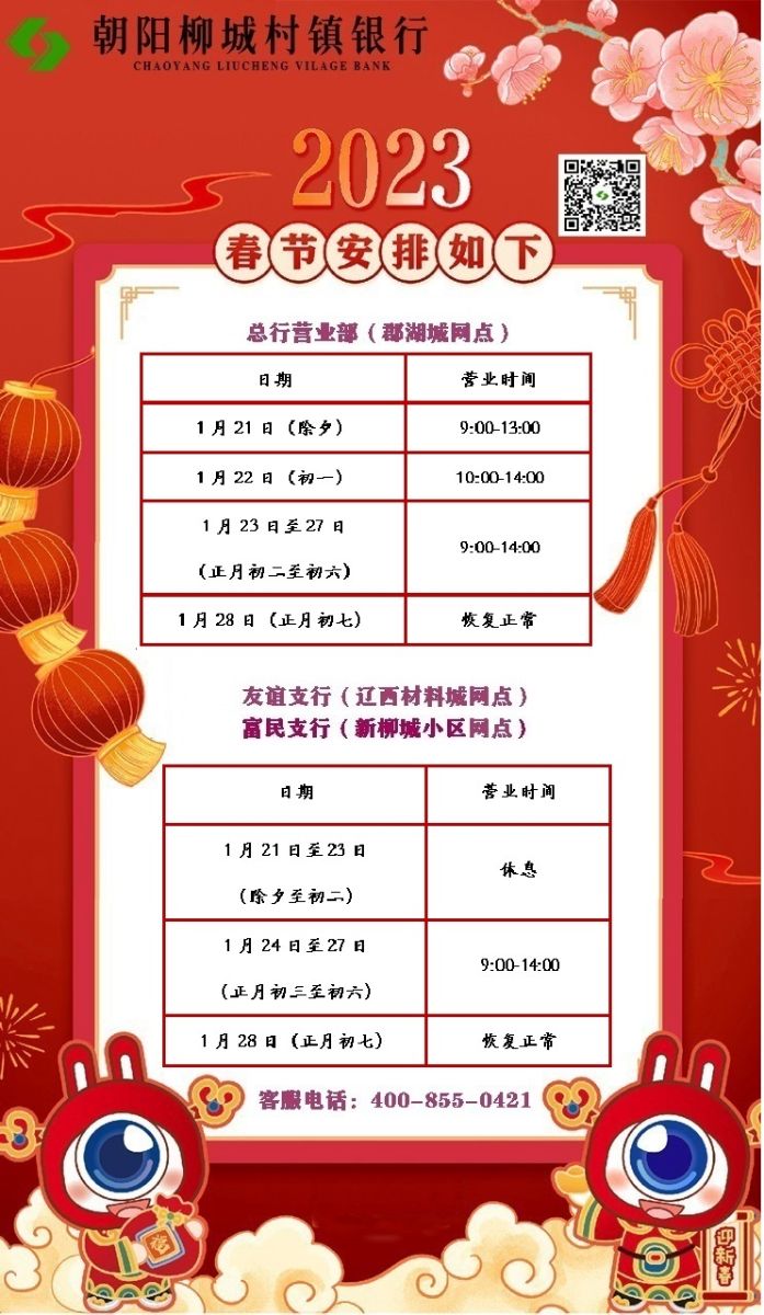 根據(jù)《國務(wù)院辦公廳關(guān)于2023年部分節(jié)假日安排的通知》精神,現(xiàn)將我行春節(jié)期間營業(yè)時間安排通知如下: